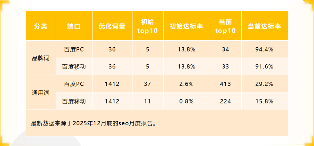 Brand Keywords (Baidu PC): Top 10 attainment rate soared from 13.8% to 94.4% (34 out of 36 keywords ranked in the top 10).